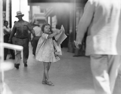 Ruth Carter selling newspapers. Ruth is standing on a sidewalk, carrying a purse and holding a stack of newspapers under one arm. She is pulling out a paper from the stack. There are unidentified passersby on the sidewalk as well.