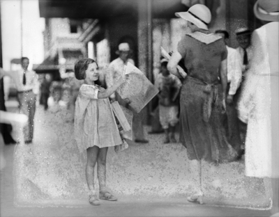 Ruth Carter selling newspapers. Ruth is standing on a sidewalk, carrying a purse and holding a stack of newspapers under one arm. She is pulling out a paper from the stack. There are unidentified passersby on the sidewalk as well.