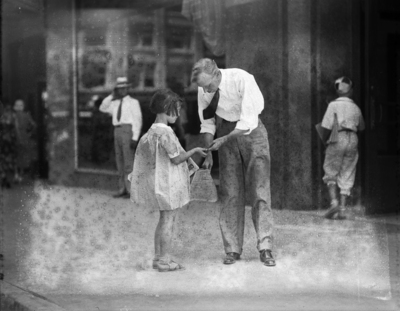 Ruth Carter selling newspapers. She is holding a stack of newspapers under her arm. A man is standing next to her, paying for a newspaper.