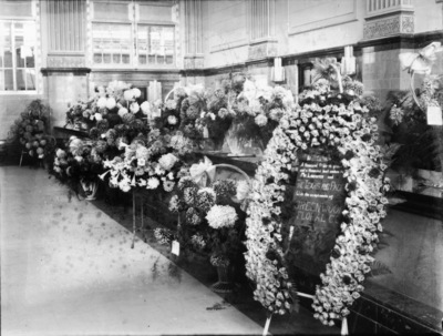 Texas and Pacific Railway passenger terminal lobby; flowers set up for opening of the new terminal, 11/02/1931