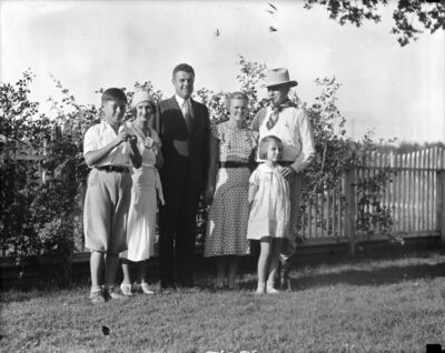 The Carter family with Mr. and Mrs. Oswald Jacoby at Shady Oak Farm. From left is Amon Carter Jr., Nenetta Burton Carter, Mr. Oswald Jacoby, Mrs. Oswald Jacoby, Amon Carter Sr., and Ruth Carter.