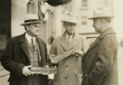 Left to right. LeRoy Smith, Jesse M. Brown, and Amon Carter, Sr. Mr. Smith and Mr. Brown are holding small metal plaques with the words "Garner for President" for John Nance Garner. Mr. Carter is reaching up with his right hand to hold the plaque in Mr. Brown's hand. All three men are wearing suits, coats, and hats.