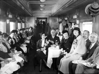 Amon G. Carter and Nenetta Burton Carter, among others, attending reception held (in the sleeper car named after Amon Carter) at the Texas & Pacific Station after the Carters returned from a trip to Asia.