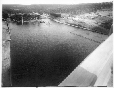 Aerial of swimming pool at Lake Cisco, Texas, largest concrete pool in the Southwest.