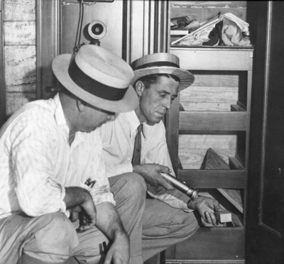 Federal Narcotics Officer Buck Nance, U.S. Commissioner Lois Newam and Federal District Attorney Clyde Eastus with narcotics found in the O.D. Stevens home, 07/15/1933