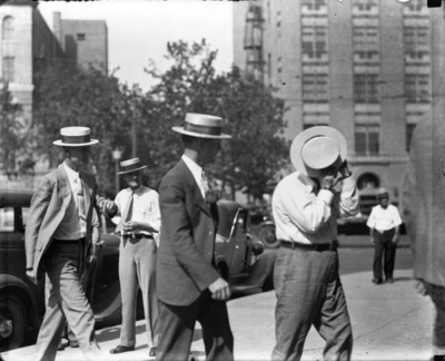 O. D. Stevens murder case; O. D. Stevens, with hat over face, being escorted to courthouse; others not identified, 07/15/1933