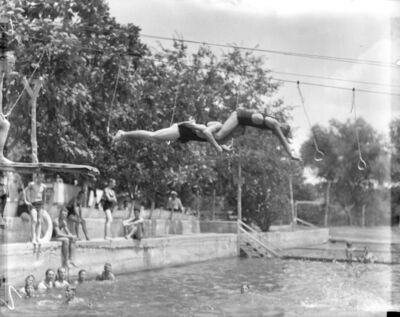 Fort Worth Star-Telegram carrier salesmen and newsboys while swimming during group outing to Glen Rose, Texas. James Allen and Morris Shepherd are seen jumping off of a springboard diving board into the water.