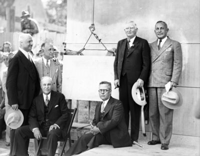 U.S. Courthouse, Fort Worth. Federal Building Dedication. James A. Farley, Postmaster General; Amon G. Carter; Congressman Fritz Lanham; J. C. Carpenter; Vice President John Nance Garner; and L. W. Robert, Jr. [deteriorated negative]