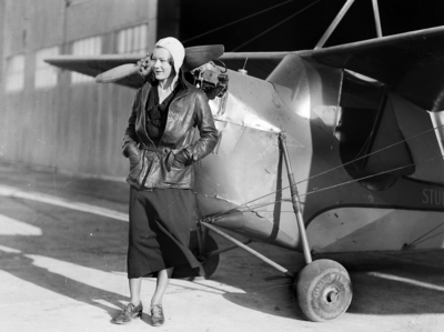 Mrs. Ed Ritchey at airport. Mrs. Ritchey is wearing a dress with a jacket standing in front of a plane.