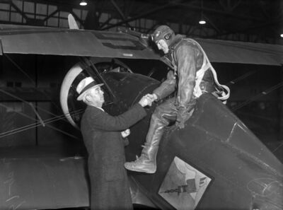 Lieutenant W. E. Davis shakes hands with H. E. Crisman from the office of assistant superintendent of airmail. Davis was first pilot to fly first Army airmail eastward.