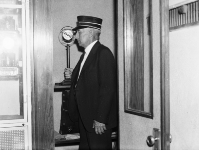 Sam T. Howell, baggage master at the Texas and Pacific Terminal who still calls the trains. He uses the public address system.
