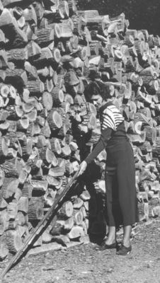 Fuel relief for families this winter -- Miss Betty Vinson, assistant city purchasing agent, measures stack of cordwood at woodyard of Tarrant County Relief Administration in Trinity Park, 10/24/1934