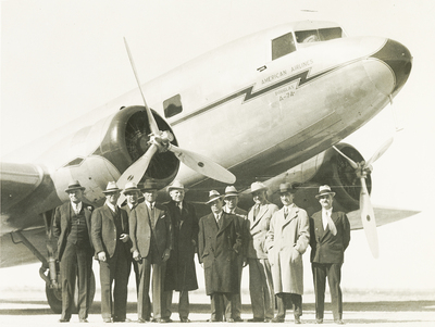 A group of men witnessed the new American Airlines twin engine Douglas passenger airplane service. The men are wearing suits and coats. The plane is behind the men.