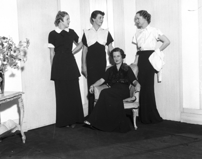 Junior Leaguers who modeled at Junior League day at the fair. Left to right, standing: Miss Elizabeth Escavaille, Mrs. Hubert Hammon Crane, and Mrs. Lee Armer. Seated is Mrs. Amon G. Carter.