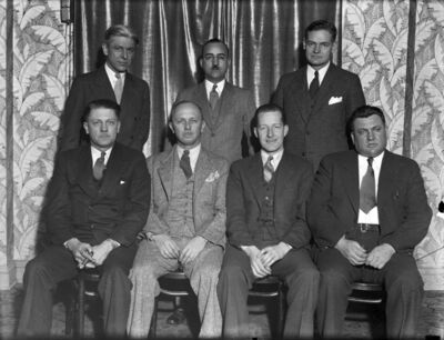 American Airlines Officials: Left to right, seated: E. A. Ward, Chicago, vice president; Hugh Smith, Fort Worth, general superintendent; William Littlewood, Chicago, chief engineer and H.D. Ingalls of Chicago, superintendent of maintenance. Standing: H. E. Mears, Chicago, communications supervisor; Clayton Shangraw, Chicago, superintendent of radio; and E. T. Cuttrell, Chicago, radio-navigation instructor.