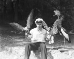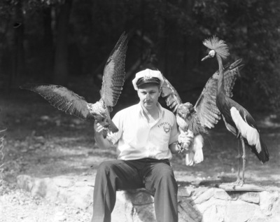 Zookeeper Hamilton Hittson with stuffed birds at Forest Park Zoo, 05/21/1935