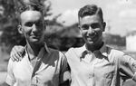 Clipping reads "Buddies are these net stars from Waxahachie, Lynn Lasswell, Jr., left, and Stuart Lumpkins, who are competing in the first annual Fort Worth invitation tennis tournament now being staged at the Meadowmere Tennis Club and Capps Park. Lumpkins is the No. 1 man of Waxahachie, and survived the opening play in the invitation, while Lasswell was eliminated by Sidney Marks. Lumpkins and Lasswell form a strong doubles team." Published in the Fort Worth Star-Telegram morning edition, August 28, 1935.