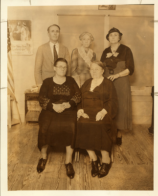 Sylvania Methodist Church honors charter member Mrs. C. F. Vance (top center) and celebrates 4th anniversary of church; standing l to r: Pastor R. B. Hooper, Mrs. Vance, mrs. A.M. Vance; seated l to r: Mrs. C.V. Smith and Mrs. J. M. McAdams, 10/12/1935
