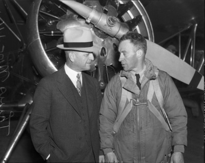 Walter B. Scott, left, with pilot, Captain Frank Hawks who is on 25,000 mile tour to raise money for Will Rogers Memorial Fund, 11/14/1935