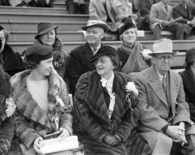 Texas Christian University (T. C. U.) fans at football game between T. C. U. and Santa Clara, CA, in San Francisco; from left on bottom, Mrs. J.H. McBride, Mrs. A.L. Shuman, J.O. Johnson; top, Mrs. Stanley A. Thompson, Mr. Thompson, Miss Helen Ione Wall of Sacramento, 12/1935