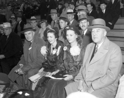 Texas Christian University (TCU) fans, Angus McDonald, Mary Weaver, and Josephine Walker, at football game between TCU and Santa Clara, California, in San Francisco, 12/1935