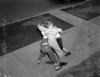 C. J. Reed, center, and Douglas Higgins, left rear, tussle with Alvin Adams and Fred Galbiati, 03/02/1936