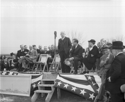 Councilman William Monnig at microphone and Lionel Bevan, Chamber of Commerce president, at Texas Frontier Centennial ground breaking, 03/10/1936