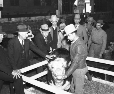 $2,000 calf called Publican Domino 47th being combed by C.M. Largent Jr. of Merkel at the Southwestern Exposition and Fat Stock Show, 03/19/1936