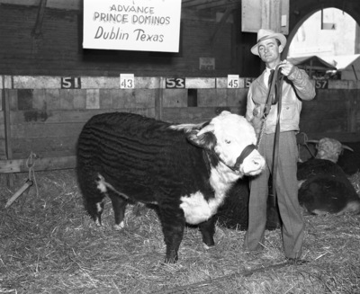 White face Hereford calf owned by Norman Martin of Dublin at Southwestern Exposition and Fat Stock Show, 03/19/1936