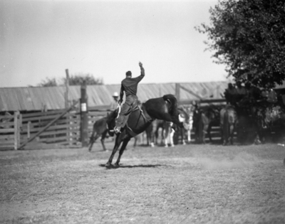 Canadian (TX Panhandle) rodeo; Pete Forrester of Calgary, Canada, on Good Enough for Fourth, was first prize winner, 07/1936