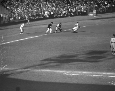 Season opener baseball game between Fort Worth Cats and Dallas Steers; Gus Brittain attempts to make third base where Jim Stroner tags him out, 04/12/1936