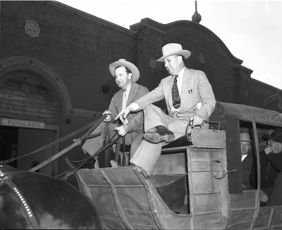 Verne Elliott and John B. Davis on 100 year old stagecoach from King Ranch at Fort Worth Frontier Centennial, 04/28/1936