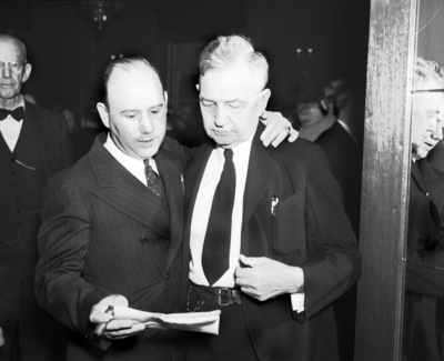 Tarrant County Ex-Service Men's Banquet honoring Col. Ernest O. Thompson; Leslie Russell, left, and C. V. Terrell, member of State Railroad Commission, at Fort Worth Club, 05/02/1936