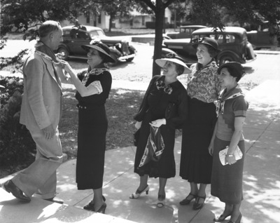 Women's goodwill tour to Weatherford on behalf of Fort Worth Frontier Centennial; Mrs. Edwin T. Phillips ties cowboy kerchief on R.G. Boger, president of Weatherford College; l. to r., Mrs. Whitehead, Miss Lotspeich, and Charlotte Max, 05/14/1936