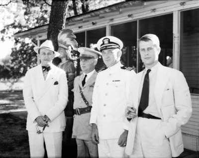 Guests at Shady Oaks Farm: l. to r., Col. Paul Wakefield of Austin, assis. To Fed. Centennial Comm.; Maj. W.W. Carr, Camp Stephen F. Austin, Cen. Texas Exposition; Cmdr. Mackey Lewis, U.S. Navy rep.; William B. Yeager, exec. Secty to Fed. Comm.