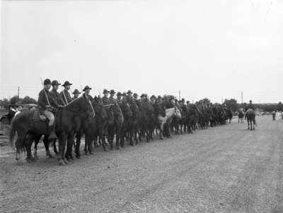 Uniformed riders (National Guard?) lined up on horseback during President Franklin D. Roosevelt's visit to Fort Worth, 06/12/1936