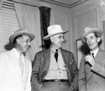 Left to right, Stephen Early, Amon Carter, and Marvin McIntyre trying on western hats; Early and McIntyre are secretaries to President Franklin D. Roosevelt, 06/12/1936