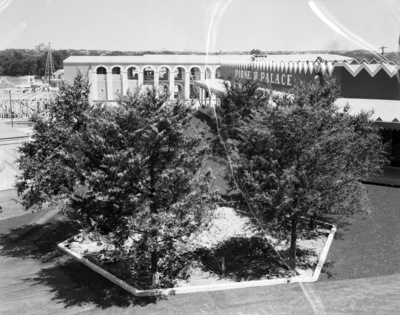 Fort Worth Frontier Centennial; looking east from balcony of Jumbo Circus building toward Pioneer Palace of Pleasure and Casa Manana arches, 06/19/1936