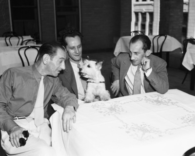 Fort Worth Frontier Centennial; Lime Trio to play at Casa Manana; l. to r., Gus, Emil, and Mike with Poochie, pet dog, 06/27/1936