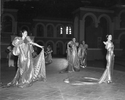 Faye Cotton in $5,000 gold gown with attendants in stage show at Casa Manana, July 1936