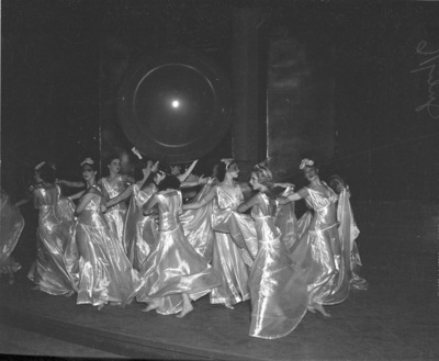 Fort Worth Frontier Centennial, Casa Manana production with dancers in Spanish court costumes on stage, 07/1936