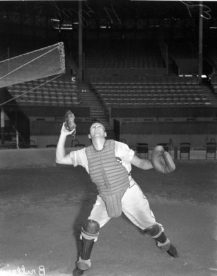 Fort Worth Cats baseball player, Gus Brittain, catching, 07/11/1936