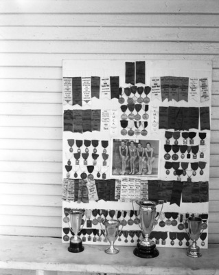 Swimming stars from Fort Worth, the Dillard sisters, Maribel, Nancy, Jane, and Babe, and their trophies and medals, 07/12/1936