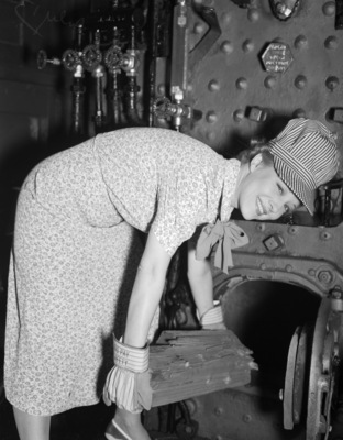 Sally Rand putting log into steam engine to kick-off "Railroad Week" at Fort Worth's Frontier Centennial, 07/13/1936