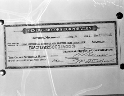 Check for $25,000 from General Motors to the Fort Worth Frontier Centennial, 07/25/1936.