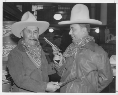 J.B. Snow, left, director of Woolworth's in London, visits Fort Worth Frontier Centennial with Merritt C. Speidel, publisher of Iowa City Press-Citizen, 08/03/1936
