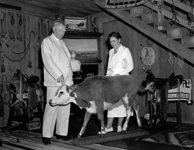 Series of photos from Vice President John Nance Garner and Ettie Garner's visit to Fort Worth for the Frontier Centennial. Garner is seen touching a taxidermied and mounted calf used by Will Rogers to practice roping. The clipping reads "A high point for Vice President and Mrs. Garner on their visit Thursday to the Fort Worth Frontier Centennial was their inspection of the Will Rogers Memorial Room in the West Texas Chamber of Commerce Exhibit Building. Deeply interested in the home furnishing and mementoes which were cherished by the famous cowboy-philosopher, who was a close friend of the Garners, the Vice President and his wife spent much time there and inspected contents of the room minutely. They are shown here on the reproduced stairway that led from the room. Both were greatly impressed with the exhibit."