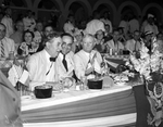 Series of photos from Vice President John Nance Garner and Ettie Garner's visit to Fort Worth for the Frontier Centennial. Pictured from left, seated at a table at Casa Manana, is Senator Tom Connally of Marlin, Texas, Senator Sherman Minton of Indiana, and John Nance Garner. The clipping reads "The Vice President of the United States came, saw, and was pleased with the Fort Worth Frontier Centennial last night. His first stop was at the Will Rogers Memorial Room where he and Mrs. Garner browsed over the things among which their friend made his home. This photo shows him at his flower-banked Casa Manana table where he joined in the resounding applause that greeted the gigantic and spectacular revue."