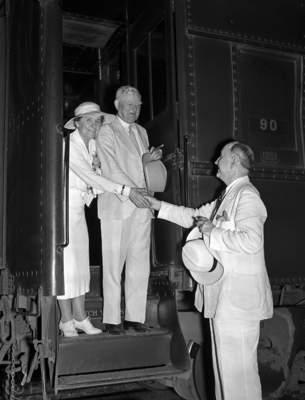 Series of photos from Vice President John Nance Garner and Ettie Garner's visit to Fort Worth for the Frontier Centennial. John Nance Garner, Franklin D. Roosevelt's 67-year-old vice president, and his wife boarded a train to return to Uvalde after a visit to Fort Worth's Frontier Centennial - the city's celebration of the 100th anniversary of Texas independence. Bidding the Garners farewell is Amon G. Carter. The clipping reads "A little weary after their full day spent at receptions and other occasions in their honor but happy over their visit, Vice President and Mrs. Garner smiled their appreciation for a good time as they said goodby Thursday night to their host, Amon G. Carter, from the steps of the train that took them back to their home in Uvalde. Both the Vice President and Mrs. Garner expressed regret that they did not plan to spend more time at the Frontier Centennial. The Vice President, expressing his views o the celebration in his own quaint way, described it as 'a darn good show.'"