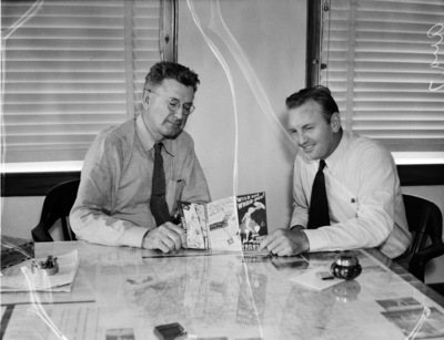State Division Engineer W. G. Welborn (left) and H. H. Allen, assistant to the state highway engineer, plan to visit Fort Worth Frontier Centennial on State Highway Day August 22, 08/07/1936.